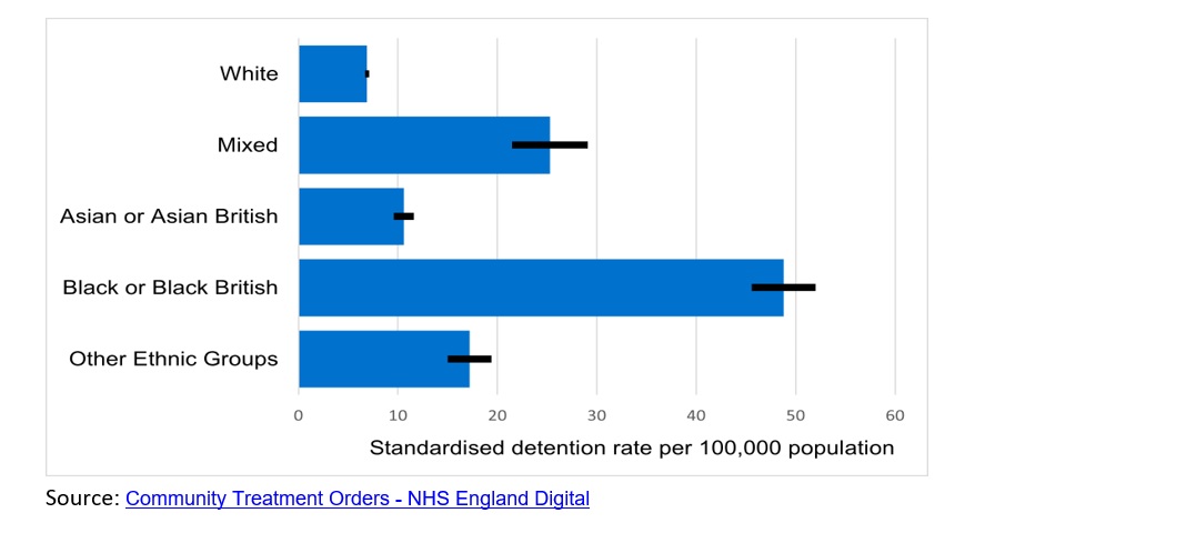 • Amongst broad ethnic groups, CTO use is highest for Black or Black British people (61.3 uses per 100,000 population). This is over eight and a half times the rate for the White group (7.5 uses per 100,000 population). See accompanying graph: